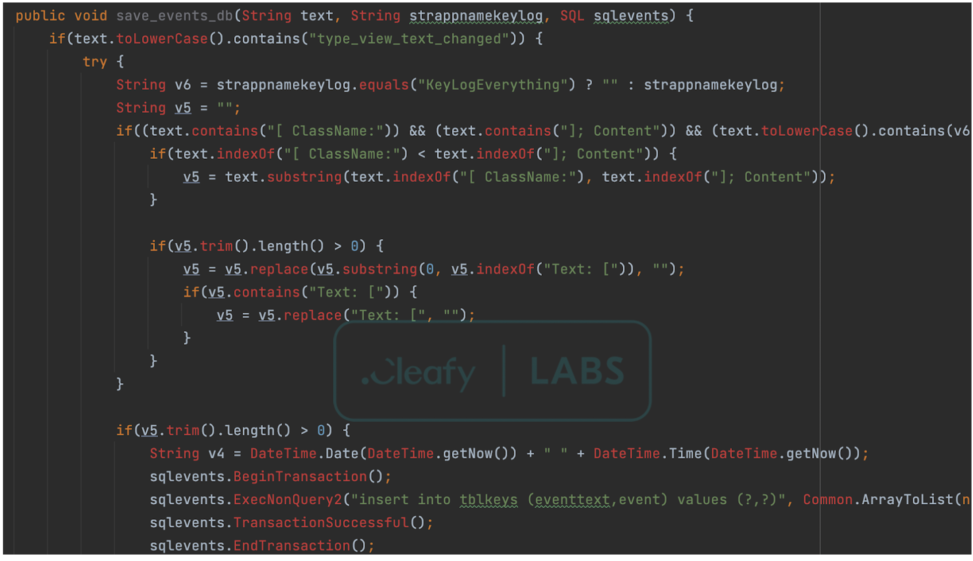 After nesting into a device, BRATA downloads a ZIP archive containing a JAR package from the C2 server. This keylogger keeps track of app-generated events and saves them locally on the device, along with text data and a timestamp.