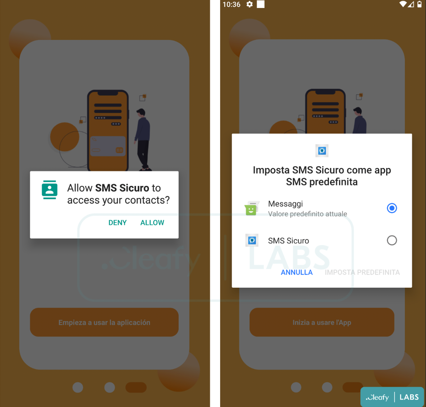 During Cleafy analysis of the last BRATA campaign, They found a suspicious app connected to the same BRATA C2 infrastructure. An SMS stealer app that leverages the same C2 infrastructure has been released. It has the same structure and class names as BRATA, but it appears to be focused only on stealing short text messages. The software asks for permission to access the device's contacts and to make it the default messaging app in order to intercept incoming SMS.